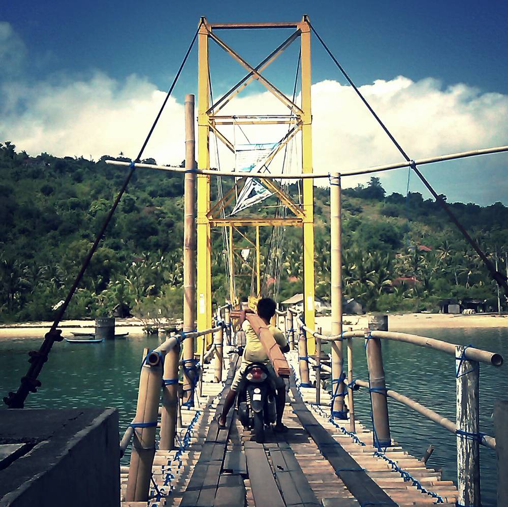 Nusa ceningan is connected to nusa lembongan via a narrow yellow suspension bridge for the use of motorbikes, bicycles and pedestrians only.